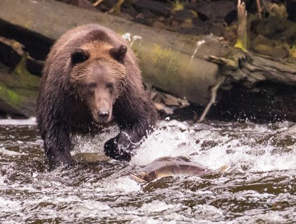 We wake to a silvery sky and a glassy ocean. Anticipation is high as rumors of a brown bear lurking up ahead stimulate the adrenalin. We anchored at Pavalof Harbor and after breakfast we are into the Zodiacs for a short trip to shore. We walk as quietly as possible along the edge of the river until we see a water fall up ahead. Three brown bears are in the rapids, then we spot a forth, fifth and even sixth! All are occasionally picking up small pink salmon to eat. Cameras whirr; everybody is very focused!
