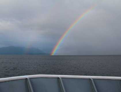 Once in the protected lee of Pavlof Harbor, activities were able to start in earnest, many taking their first steps into the Tongass temperate rain forest and the wonders in vibrant green that lay within on interpretive hikes. Others took to paddling amongst facetiously breaching salmon on their way to the local fish ladder or zooming along the coast for an overview of the dynamic intertidal zone that is so integral to this ecosystem. Blue skies and golden exclamations of light occasionally would burst out of the clouds that shrouded the surrounding peaks in a calming grey. Punctuated at the end of the day by a pair of gleaming rainbows a newcomer to Alaska might say, “Isn’t it nice it rained on and off all day?”