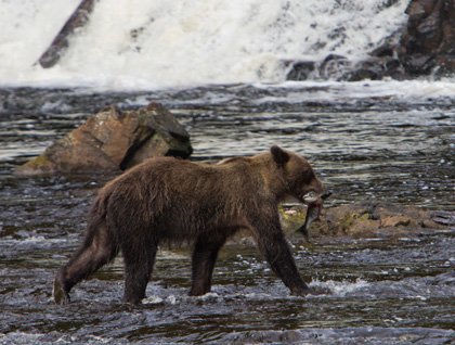 Approaching a waterfall filled with salmon, many of us quickly got to experience brown bears catching fish. Throughout the morning, various bears came and went from the stream. The buffet was open, everyone knew it, and we watched the procession. Each bear seemed to have a different technique. Some would choose a shallow spot and chase the fish, at times becoming picky and discarding fish they didn’t want. Others worked into the falls themselves, catching fish as they attempted to jump to the lake above. And finally, one skittish bear plunged deep into a pool filled with fish. Coming up with a large male pink salmon, it quickly ran off into the woods. It was an incredible morning and a fascinating experience to spend our time at the salmon buffet.