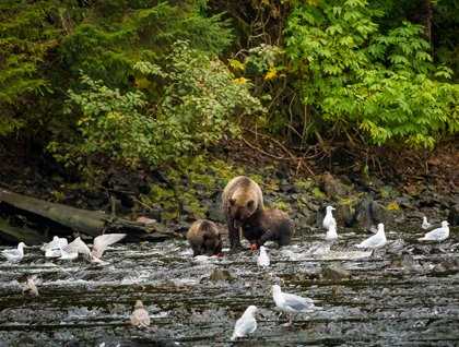 We awakened this morning aboard National Geographic Sea Lion to overcast but dry skies. Mist clung to the trees along the shoreline as the ship anchored off Pavlof Harbor, where we planned to spend our morning. In the spring and early summer we take hikes here along a large stream with gushing waterfall, through the beautiful forest and meadows, and around a great lake. But by mid-summer the focus of our outing shifts. The salmon begin to fill the stream, swimming up to spawn, and attracting all manner of wildlife to feed. Especially bears. Our plan was to shuttle ashore and keep vigil on the stream in the hope that at least one hungry bear would show up to fish. We stood in a condensed area along one side of the bank downstream, and watched in amazement as a mother and her two cubs fished and shared their meal, and another solitary bear fished and swam. Another solitary bear that had been there initially, wandered off into the forest, and later, another appeared. The staff held the perimeter of our group and kept watch of the bears, their movements, and also the edges along the forest and the stream in all directions. Wow! What an amazing opportunity to watch these massive creatures go about their daily business, and avoid and interact with each other. Towards the end of our viewing the solitary bear charged at the mom and her two cubs, who ran into the forest alongside where we were standing. We moved our group quickly downstream to the waiting expedition crafts, donned life jackets, and left shore. What an incredible encounter! Back onboard we gathered in the lounge for a presentation and discussion about the remarkable role that salmon play in the Pacific Northwest ecosystem.