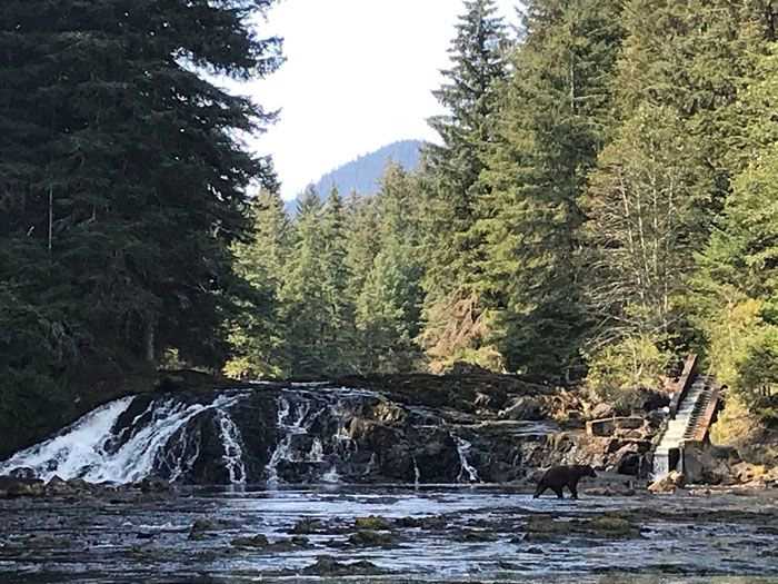 During the morning, we explored the scenic cove of Pavlof’s Harbor on the southeast shore of Freshwater Bay, Chichagof Island, and area known for its healthy salmon stream. We were optimistic that we might still see a bear during our last day exploring Southeast Alaska. We were not disappointed! At the base of a small waterfall, we spotted a coastal brown bear casually gorging itself on salmon as we watched, spellbound, from the safety of our expedition landing crafts only a few yards away.
