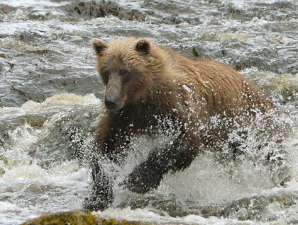 Admiralty, Baranof, and Chichagof are large islands enveloped by rain forest and laced with salmon streams. This morning we focused our activities around a tannin-stained river that empties into Freshwater Bay at the edge of Chichagof Island. Abundant salmon and freshwater attracted native Tlingits, early traders, and fish processing operators over the years. Brown bears too come to this stream for the salmon run in late summer.