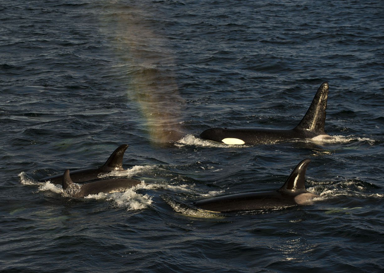 At 5:20 a.m. our expedition leader woke those aboard National Geographic Sea Bird for our fourth killer whale sighting during this week-long trip. We were cruising in Chatham strait between Chichagof and Admiralty Islands. Light filtered through clouds over Admiralty Island as the sun rose in the east. Chatham Strait, a deep and wide fjord, was fairly calm this morning, which had allowed those on the bridge of Sea Bird to spot this very large group of killer whales.
