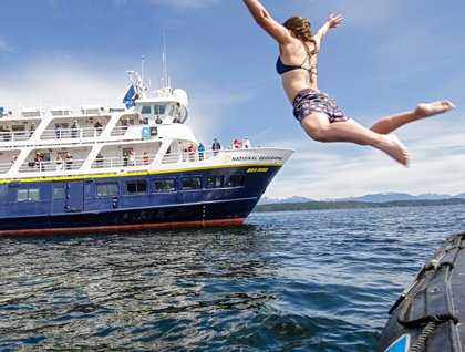 Pavlof Harbor is an important salmon stream that is surrounded by old growth forest and a high concentration of bears. Within weeks, the pink salmon will be running in force. The Southeast Alaska sun warmed our bodies and we strolled through the forest and kayaked the bay. This created the perfect opportunity for a “polar plunge” when we returned to the ship and over two dozen of the guest participated in a quick dive into the low 50 degree waters for a true Alaskan experience.