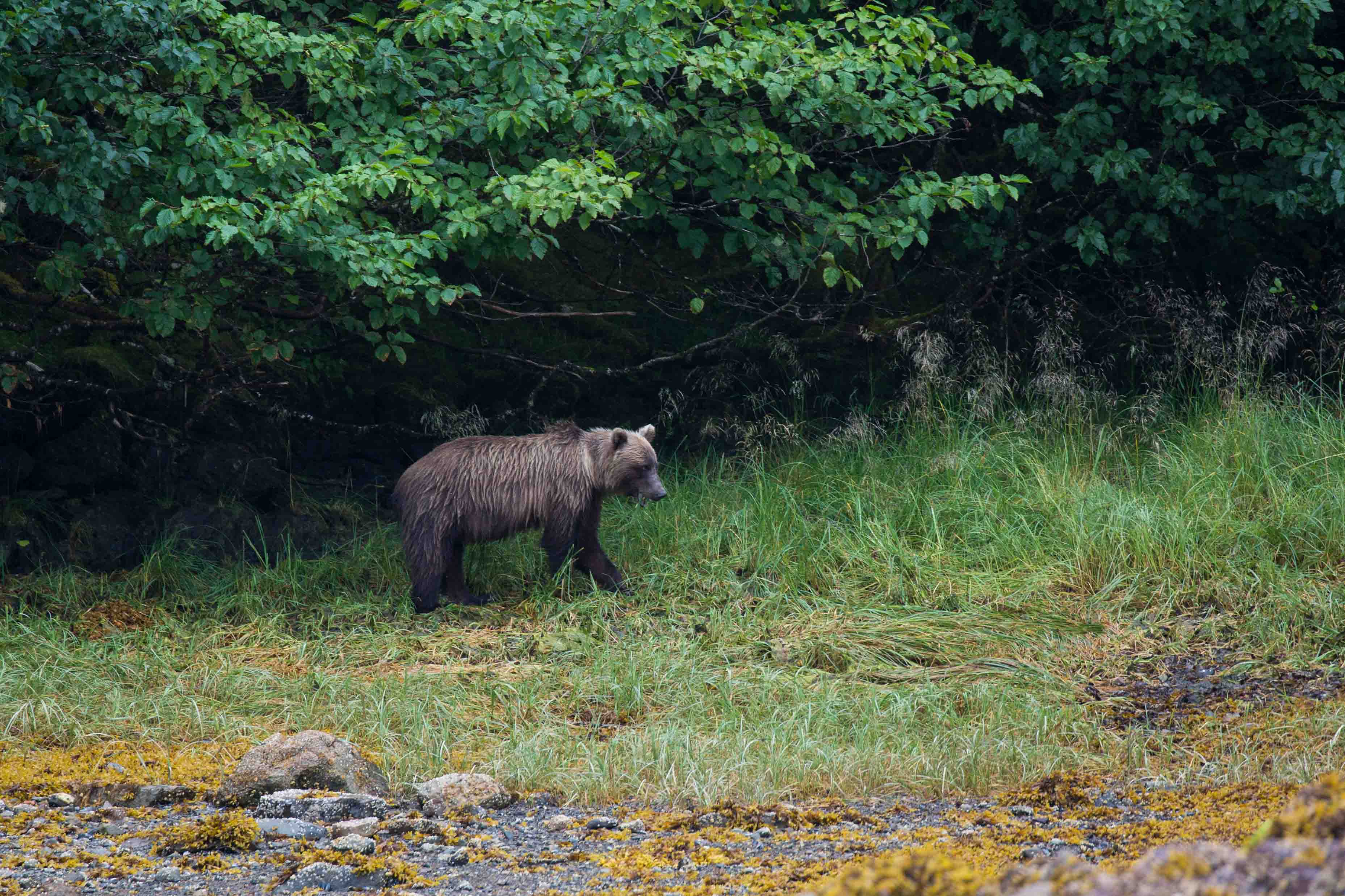 How often have we said that nature has a wicked sense of humor? She lets you stack most of the variables in your favor, then yanks the rug out from under you!  This morning two groups of guests sat patiently, and quietly waiting and watching for bears, while Julia, one of our naturalists, fed us thimbleberries she had gathered on the upper beach. We waited, and watched, but saw no bears... quite yet. But the beach at Pavlov Bay is rich with sealife, and we had a good minus tide on which to look at ghost shrimp, mottled sea stars, blue mussels, heart cockles, and a host of other amazing intertidal invertebrates. The upper beach was dominated by Pacific silverweed, yarrow, and seaside beach grasses that gave use opportunities to discuss plant adaptations to salty soils.