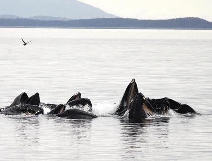 Though many of us could have continued to watch the bear for hours, eventually it was time to continue heading north. However, any disappointment was soon forgotten once we rounded the northeastern tip of Chichagof Island and spotted a group of bubble-netting humpback whales. Captain Hook and the ‘Chatham Strait black fluke gang’ were there in full force! We dropped a hydrophone and listened to their loud, trumpet like feeding calls while waiting, transfixed, for the first sign of bubbles at the surface. And then there it was, a flash of herring, followed by a full lunge with at least a dozen animals breaking the surface in synchrony! Then, a few minutes later, another lunge! This carried on for hours - we even broke for dinner, yet watched the animals from the dining room window as we enjoyed our meal! We continued to watch the animals feed from the bow, nightcap in hand, until the light began to fade. When we finally retired to our rooms, there was a general sense that this would be a tough day to beat!