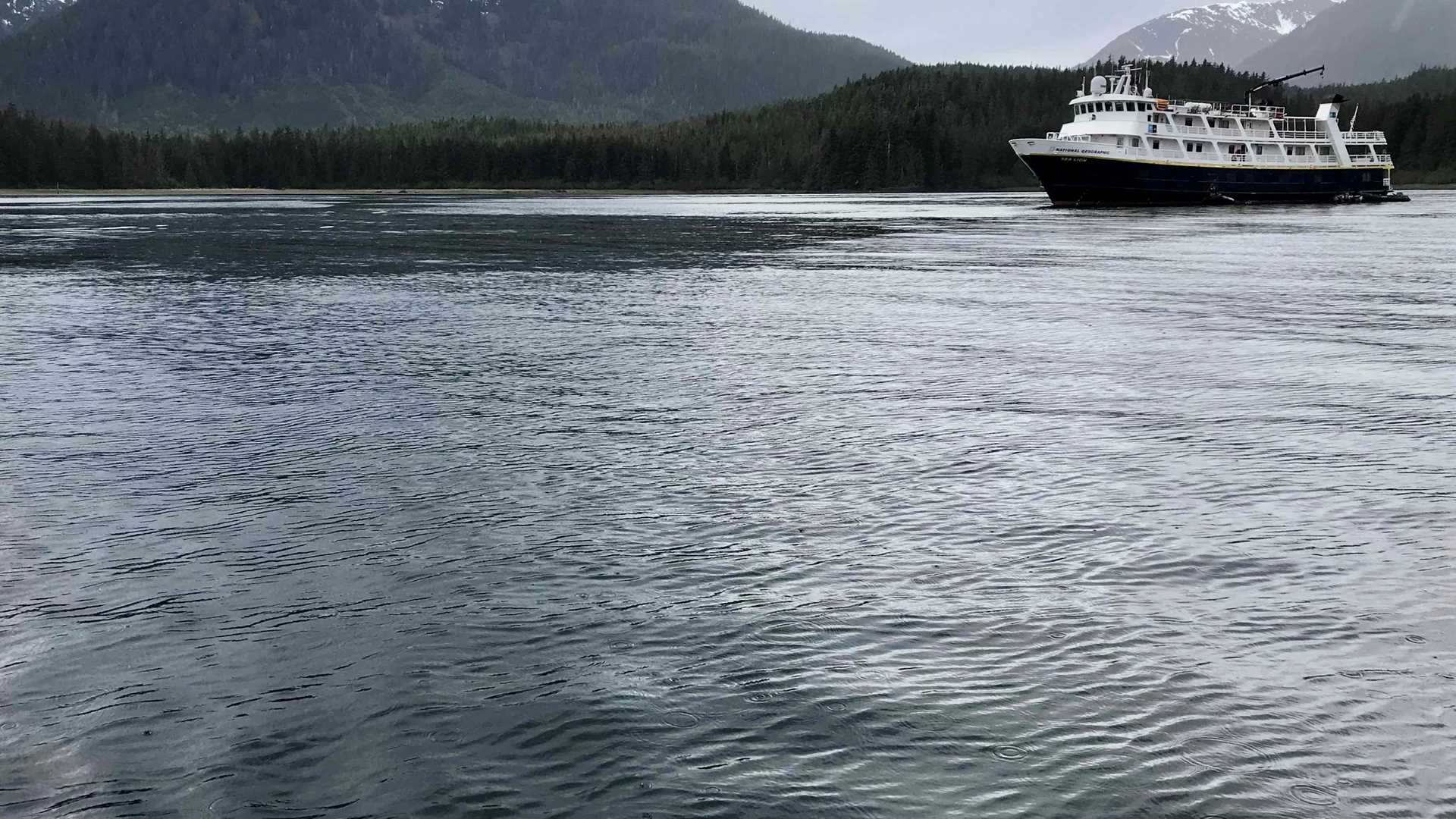 There is a special briskness to waking up at sea that you can’t find anywhere else – the motion of the waves lilting under the bow as you peer over the rail, the air cutting through any lingering fog from sleep. As we snoozed last night, the bridge team guided us carefully through Sergius Narrows and Peril Strait, leaving Baranof Island behind. Chichagof Island greeted us with some uncannily calm and clear weather as we cruised up Chatham Strait. After some brilliant photography in the morning light, our morning was spent learning the intricacies of bear safety, dressing for drizzle, and tactical intertidal footwear. We discovered quickly that we shouldn’t get too comfortable, however, as a humpback whale lounging near shore brought us all out on deck part way through the photography lecture.