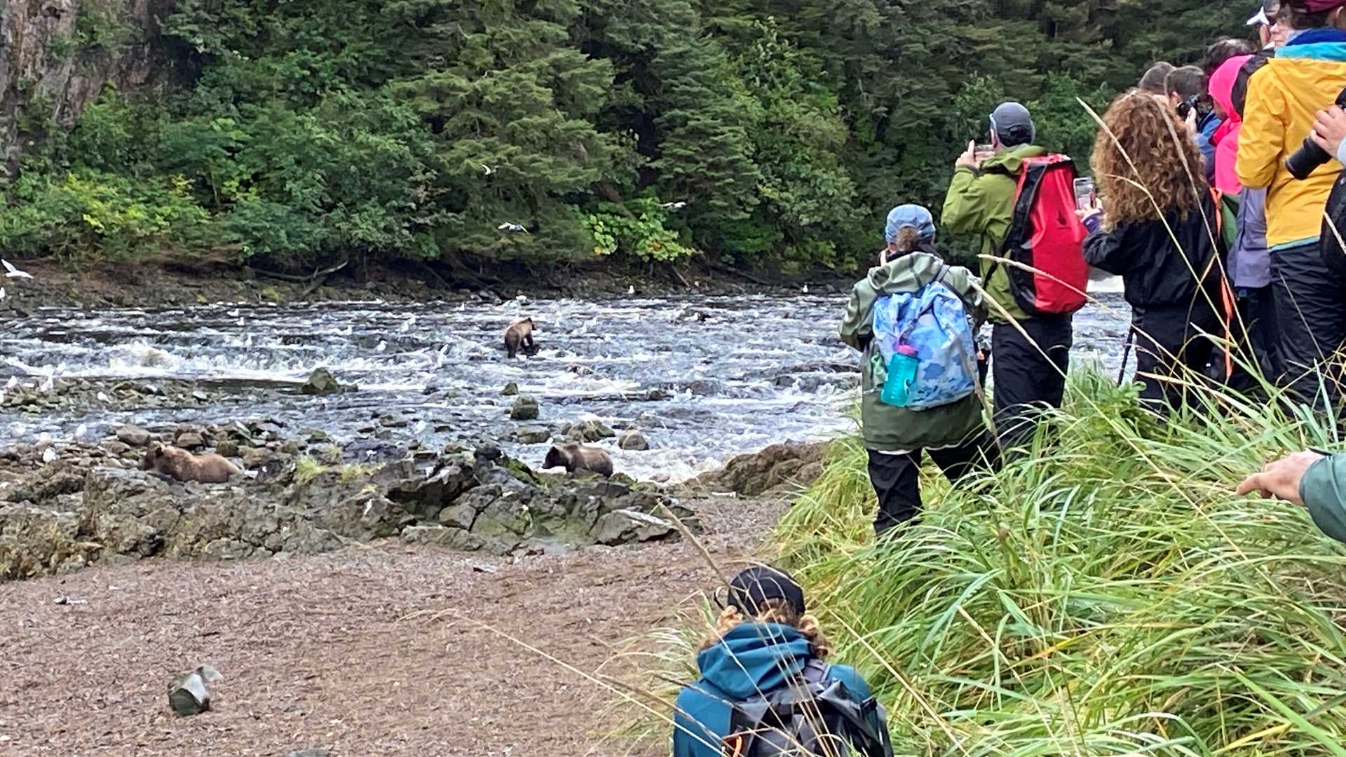 Our first group returned to the ship, and we kept our fingers crossed that the bears would remain. We were not disappointed! In fact, the second viewing was possibly even more exciting. A total of eight bears were seen, and while we watched the waterfall action, the mother and her two cubs emerged behind us on the trail we intended to use! Our plans quickly changed; we loaded our Zodiacs and made our retreat, allowing the bears full access to the beach and their salmon breakfast.