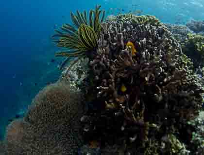 Plunging straight down at least two hundred meters, this was a perfect place to explore. Some went on SCUBA, others boarded the glass bottom Zodiac named for Tom Ritchie, and the majority decided to snorkel. The shallows were filled with healthy corals and vibrant fish. For me, however, the drop was the place to be. On one side, you have a rainbow of pulsing fish, and on the other – blue, blue, and more blue. Passing by, clouds of fish break up the deep hues and keep it exciting. This is the type of spot that I never tire of.