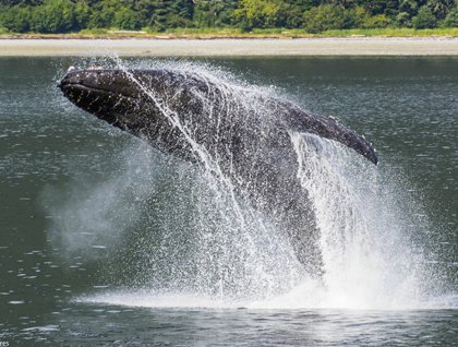 Andy headed homeward just before lunch, and we eased through the fog toward Morris Reef. This is a good spot for whales, but the fog persisted, limiting our view. By early afternoon we motored into Peril Strait, where conditions and our luck changed. Under bright sun we found a humpback. Melville called humpbacks “the most gamesome of whales,” and this one lived up to this description. Again and again the whale did a “chin-breach,” tossing its head above the surface to make a hefty splash. Finally, after all cameras were turned on and focused, the whale gave a full breach at close range. It was a spectacular view of all that makes humpbacks the most beautiful of whales—elegant form, pied patterning, and the longest limbs of any creature on the planet. Those with cameras and those with biologic lenses and memories couldn’t have been better pleased!