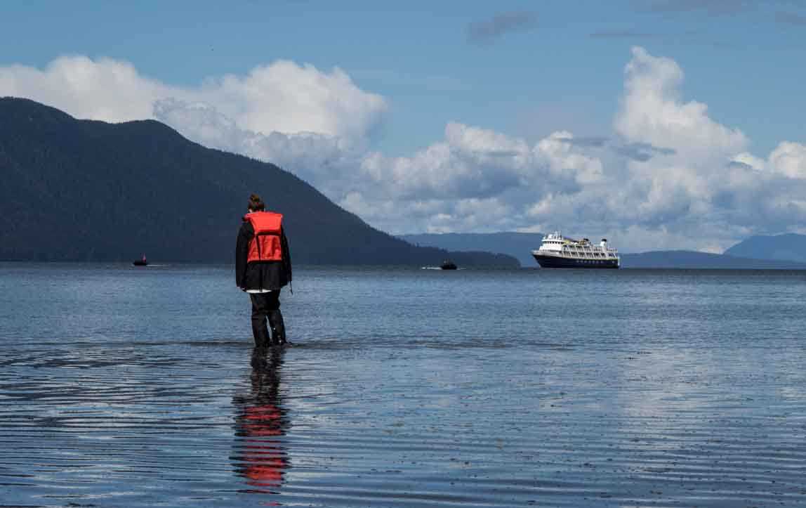 The ship arrived at Hanus Bay off Baranof Island and anchored for the afternoon.  Time to bond with our rubber boots!  Zodiacs zipped us ashore, and we swung legs over into the intertidal zone.  Walkers separated into various groups of leisurely, moderate, photo and long aerobic walkers to experience this small portion of the enormous Tongass National Forest.  What a great introduction to the temperate rainforest of Southeast Alaska… beautiful mixed forest following alongside a river, leading to old growth Sitka spruce trees at Lake Eva.  We saw signs of deer, bear, squirrels, and heard the songs and calls of many birds.  The weather remained pretty even, with a few sprinkles, followed by clearing and bright sunshine.  At this writing we are gathering in the lounge for cocktails and appetizers.