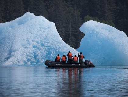 Following a late evening of watching humpback whales in Stephens Passage, the morning sun greeted us with clear skies, calm winds and a very comfortable 60*F. After a delicious breakfast, we loaded into expedition landing craft to see large icebergs which had floated down from their calving some 10 miles up the ice choked LeConte glacier fjord. As we crossed the terminal moraine, a slight color change in the ocean water indicated the presence of glacial flour. Our journey brought us close to icebergs the size of small houses beached on the shores, left there from the ebbing tide. Discussions ensued as to the rate of glacier retreat potentially related to climate change with National Geographic Sea Lion’s naturalists sharing that one needs to also take a series of long-term measurements of the ice field depth to better evaluate potential impacts of climate change on ice field mass. Further conversation shifted to the contrast to the white tops of the icebergs exposed to the atmosphere and the bluish tinge of the normally submarine section (now suspended on a moraine shelf by the low tide) caused by the increased density of the ice when placed under great pressure inside a glacier. It is this ice that was historically used to prevent fish from spoiling while being transported to Seattle, Portland and other west coast markets in the early 1900s.