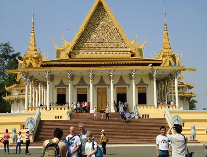 Our first stop is the Royal Palace and the magnificent Silver Pagoda, as well as other palace attractions now including a miniature replica of Angkor Wat. The Palace. The French influence is evident only in the equestrian statue presented to King Norodom in the 1860s by Napoleon III, but with the later substitution of the head of Norodom himself. The Silver Pagoda is named for its solid silver floor panels, and is dominated by a two-foot “emerald” Buddha, made, in reality, of a translucent jadeite.