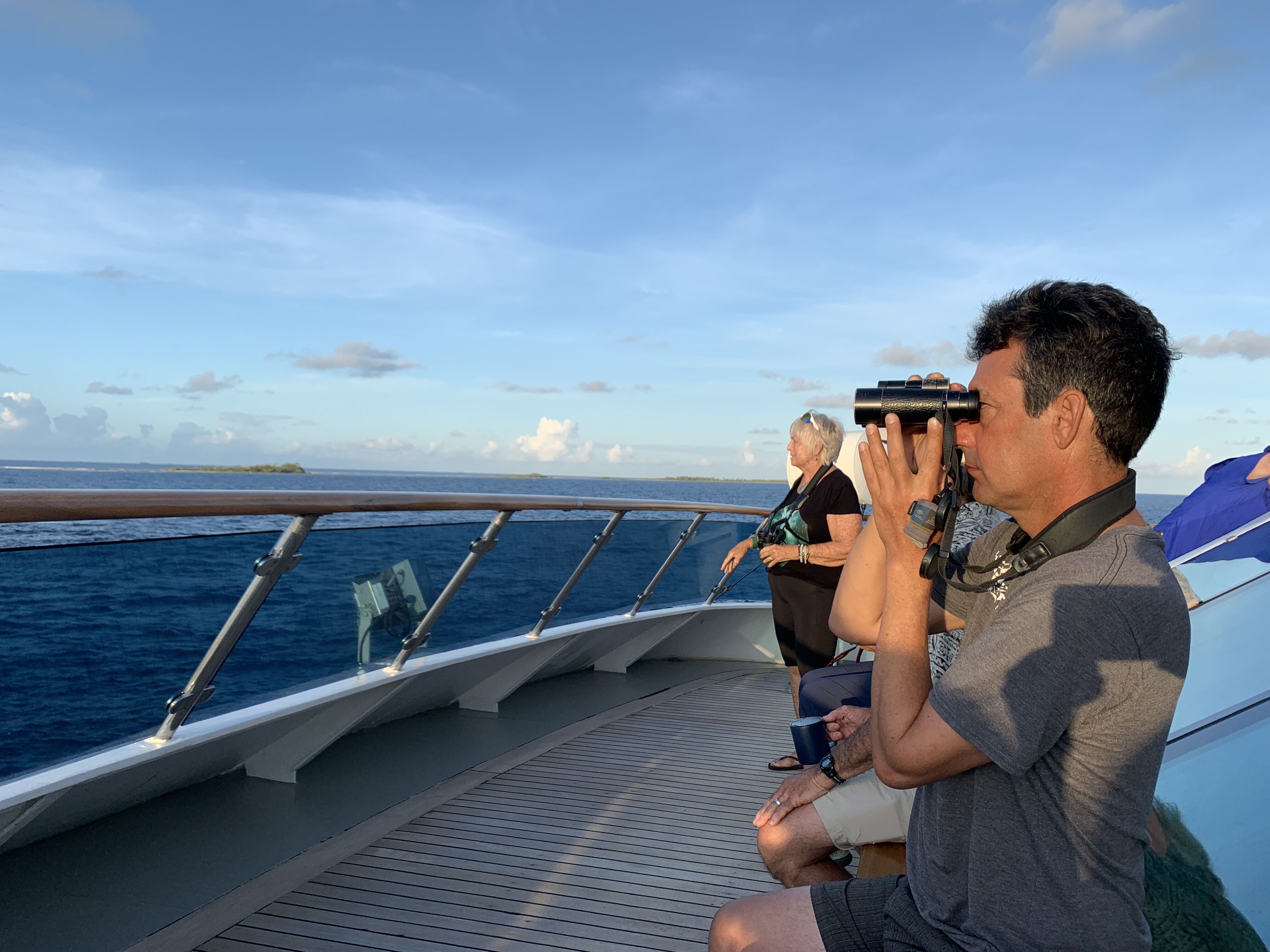 We woke up to super calm waters off the northern coastline of Floreana Island. Perfect conditions for a bit of kayaking among the offshore islets near Post Office Bay! Brown pelicans, egrets, green sea turtles, and red, black, and white mangroves…a peaceful environment for an hour or so before breakfast. Some guests went straight to the beach to walk a few yards through saltbushes and found themselves facing the famous “barrel” of Post Office Bay. It’s been over a century since the barrel was first placed here for use by whalers to exchange correspondence and carry back letters of business, or perhaps letters to loved ones. Today, postcards fill the barrel, but the turnover is fast. Each day, some of the postcards are taken for delivery while others are left behind in hopes that someone will continue the tradition and hand-deliver them in the weeks to come. Between breakfast and lunch, we played in or on the water around Champion Islet, just to the northeast of Floreana Island. We didn’t make a landing but explored by Zodiac, including a birdwatching circumnavigation followed by deep-water snorkeling in incredible waters with parrotfish, angelfish, pufferfish, damselfish…all kinds of fish! Sea lions buzzed by, desperate to draw attention and get a reaction out of us, which they did. Squeals and shrieks were heard. After an instructional briefing on iPhone photography and a presentation on Charles Darwin in the afternoon, we went ashore on the main island of Floreana. There has been quite a drought this year and not much rain the previous year either. The land was dry, the vegetation was brittle, and dead leaves were everywhere. But all that is fine for the native and endemic species; after all, they’ve been through this before, over the millennia, and survived. The stress is on the introduced species who depend on higher amounts of freshwater for survival. While their defenses are down and populations are stressed, now is the time to really push for programs to eradicate introduced species. Floreana Island is ready for restoration. The National Park and collaborating NGOs are preparing Floreana to receive native species that were once thought doomed for extinction. Giant tortoises, Floreana mockingbirds, and racer snakes may yet survive and prosper with the help of these organizations. We spent the afternoon following an easy trail from a dark-colored beach of mineral origin and over the isthmus to a white, organic beach where green sea turtles were riding the breakers offshore. The turtles are not quite ready to come ashore and lay eggs, as temperatures are still too low for another month or so. But a great blue heron and frigatebird were checking out the scene, just in case someone tried for an early nesting. It will be a couple months before hatchlings try to race to the ocean in the dark of night. We returned to our base of operations as the sun set low on the horizon. National Geographic Islander II was waiting for us with hot water and the comforts of home.