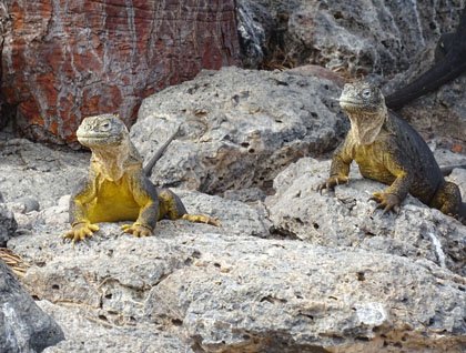 Today we arrived at South Plaza Island which is right next to the island of Santa Cruz. This is one of the best places to find Galapagos land iguanas and this morning we found many of these reptiles all along the trail that traverses most of the island. One of the most interesting sightings this morning was a hybrid iguana, locally known as “the weirdoes of Plazas. This is the result of the breeding of a Galapagos land iguana with a marine iguana. This hybrid was walking among a large group of land iguanas and was feeding on a large piece of prickly pear cactus.