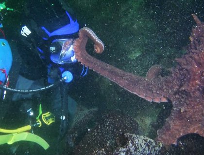 While guests were negotiating which friendly island dog to pet first, Second Mate Carter, Chef Michelle, and I went for a dive at a new dive spot. Working with some helpful hints from Auke Bay locals, Flip and Linda Nicklin, we decided upon a precipitous drop-off not far from the lighthouse. Following a dramatic rock wall to 100 feet, we could see the abyss continue below to unimaginable depths. What lies past the reach of our insignificant lights? We explored along the rocky slope looking for the denizen known as the devilfish. Finning along we were distracted by a curious behavior I’ve never seen before nor read about: hiding beneath the stinging tentacles of a crimson anemone was a crested sculpin. Could this be a newly observed behavior? We finally reached a pile of rocks and (literally) ran into our quarry, a very large giant Pacific octopus. The octo was standing tall, which usually means it’s feeding, it was so camouflaged I didn’t spot it until the last possible second. After enveloping the video camera and then replaying the footage, we could clearly see a crab had indeed met its reaper. We stayed with the octopus for several minutes and it became very interactive, inspecting my dive gear, and wrapping one arm after another around my bare hand. The feeling of curious suckers on my skin will stick with me forever. Begrudgingly we left the octopus, feeling like a connection was made, one intelligent creature communing with another. The devilfish we encountered today didn’t have a single drop of malice and only showed a gentle curiosity.