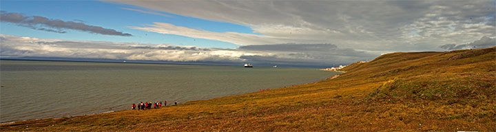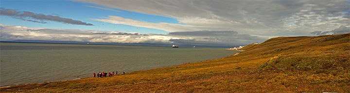 At noon we anchored off the hamlet of Pond Inlet. Pond Inlet is unusually large for a village located this far north. Fifty years ago, the government located a boarding school here and sent the children from the smaller communities to live in dormitories. The parents could not bear the separation and moved here to be near their families, effectively condensing dozens of smaller villages into this hamlet. Archaeologically and historically, it has been the site of Thule and Inuit habitation for hundreds of years, and was the site of a Hudson’s Bay trading post, whaling station, and the first Royal Canadian Mounted Police station in the region. Pond Inlet hunters are renowned for their abilities for catching narwhale.