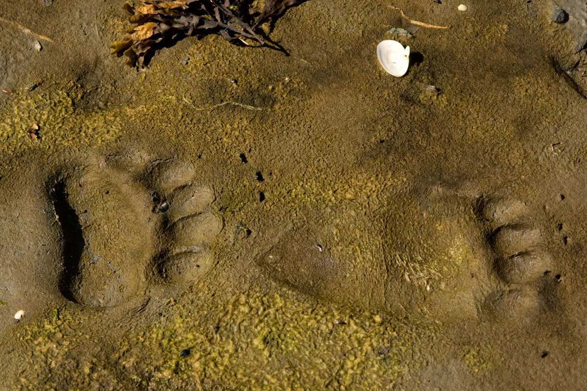 Kayakers headed out into the misty world of the protected waters of Port Althorp while hikers made their way through tall beach ryegrass and a myriad of shore plants heading towards the edges of the forest. We were immediately aware of being in the “fortress of the bear.” First, we encountered perennial bear footprints just past our landing site. Brown bears are creatures of habit and to see well-defined bear footprints, one after another made for days, months and years...WOW! The bears were walking through very thick soil covered in wild strawberries, nagoon berries, northern rice lilies, five-leaf bramble berries, and so much more. One could see the long days of this short growing season produced a huge amount of wild food for harvesters, be it a bear or even a human. As our groups moved out across the mud flats just in front of a steep hill covered in western hemlock and Sitka spruce, we saw our first of hundreds of brown bear paw prints. Every pause on the mud flats showed more prints of varying ages, many from days past and definitely some from this morning. The paw prints were either heading towards the salmon river or back to the forest. One could feel those brown eyes watching us and waiting for our passage so they could return to their foraging among the tall grass at the edge of the mud flats.