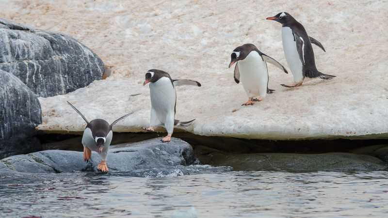 between the icebergs and could be seen porpoising in every direction. Not to be outdone, a group of crab eater seals sunned themselves on a nearby ice floe, while a trio of leopard seals hunted penguins below.