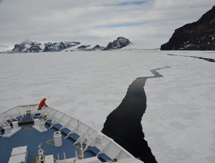 Sea ice is always moving and never stationary, as we discovered once again in the late afternoon. An immense amount of pack ice had moved directly into our intended path. Once again, the National Geographic Orion forged easily through the ice, pushing floes to either side or cracking them in two as we steamed forward. The sounds and bumps of constant ice deflection reminded us of the environment through which we were sailing.