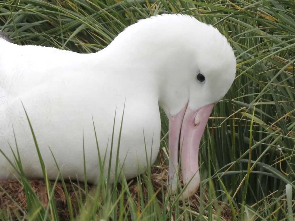 Fresh snow blanketed the shores and peaks of South Georgia during the night, providing a colourful canvas of white, brown, green, and ocean blue for our morning outing. Prion Island was the chosen destination, a small island within the Bay of Isles in the northeast coast of South Georgia. We are here to see the wandering albatross. These are ocean dwellers with the largest wingspan of any other living bird, and second only to the long-extinct Palagornis Sandersi, with a wingspan of 24 feet! We have watched them following our route to and back from Antarctica, and today we have an opportunity to see them up close. And we are not disappointed! Our expectations grew as we climbed the boardwalk onto the top of the island, where we found twelve nests at close view. The wandering albatrosses were sitting on pedestal-like nests, caring for their young and rearranging their homes. But, when the wind picked up the albatrosses became very active, taking off like paragliders and extending their majestic wings.