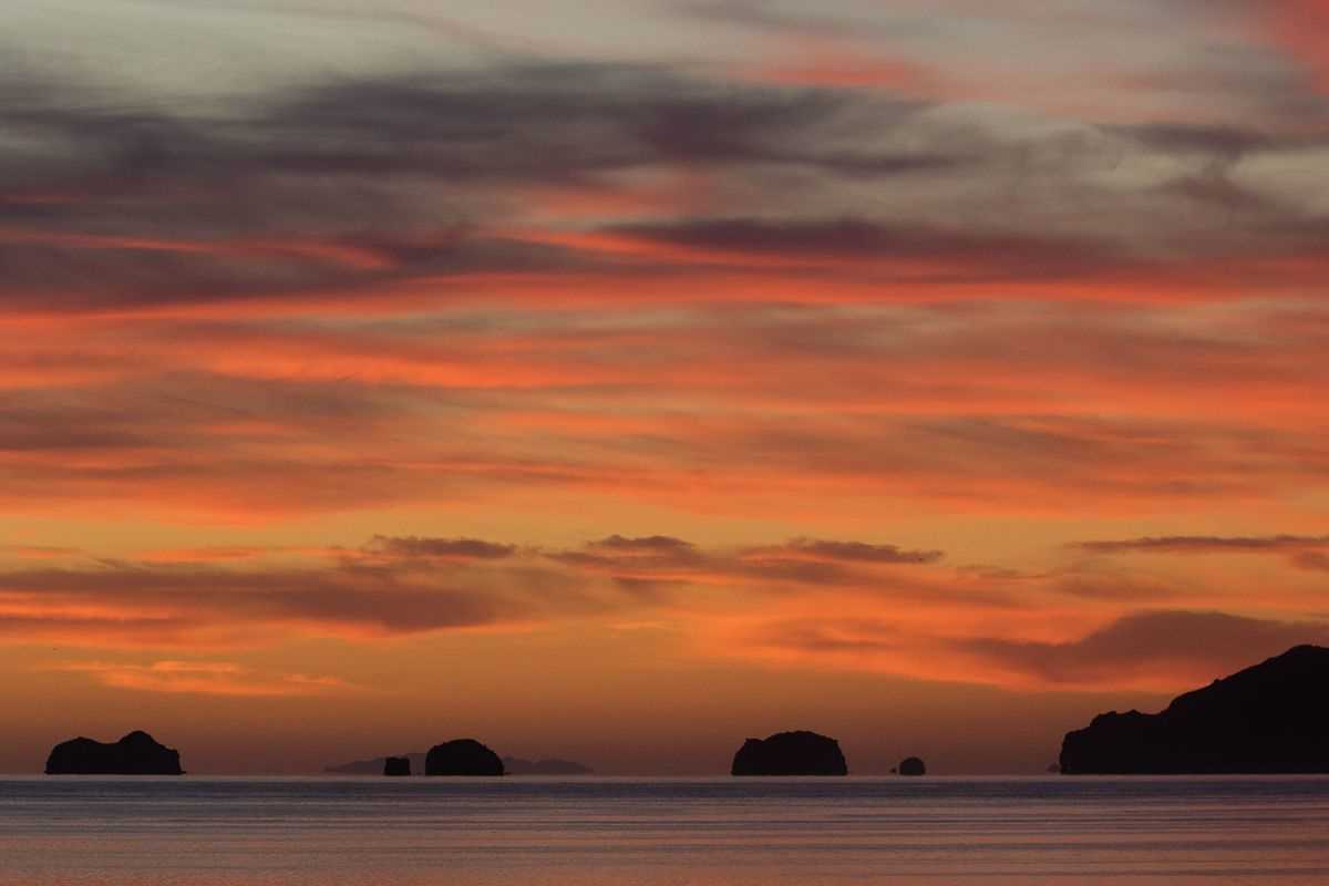 We docked at Puerto Escondido as the slow flare of the early morning skies exhibited bright pinks, reds, and oranges all around us. The dramatic display of sky reflected with great intensity off a gleaming horizon while craggy, serrated cliffs and layered ash flows descend into the sea. It does not take much to lose one’s breath to the beauty of this space.