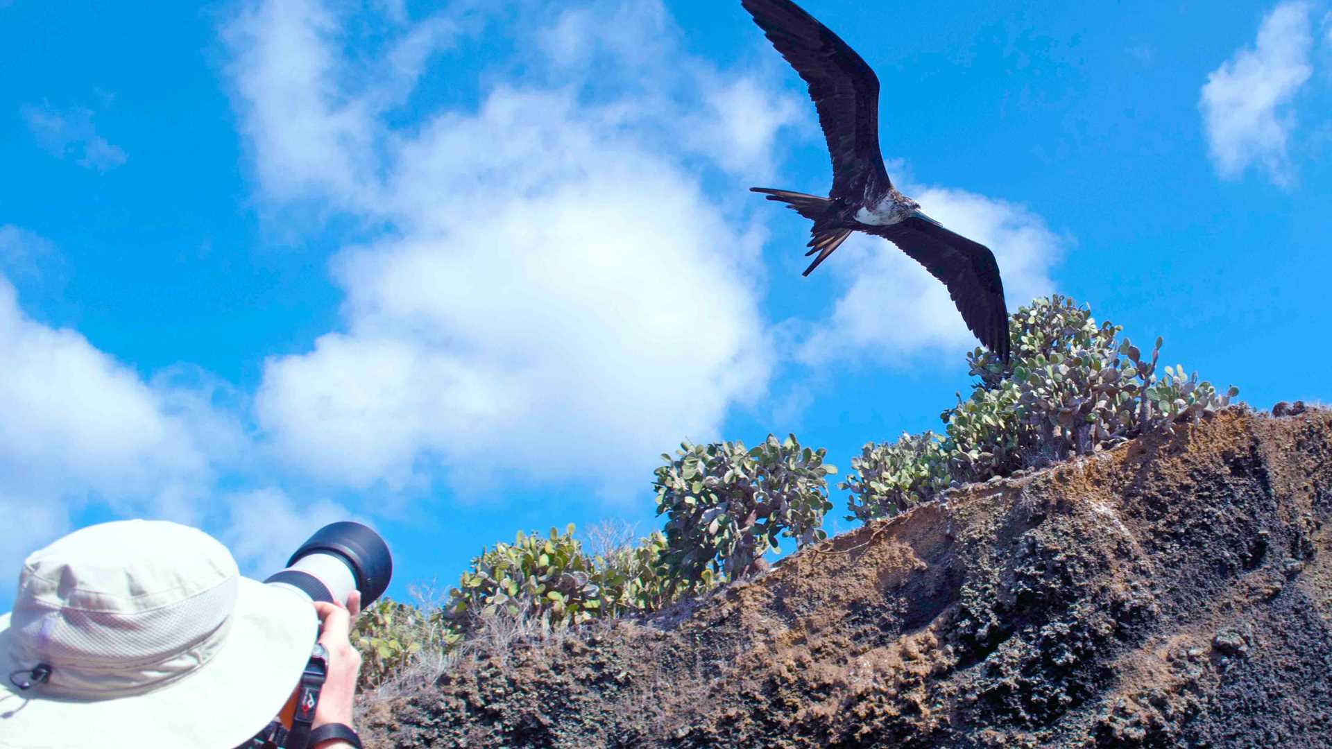 After breakfast, we explored Champion islet, where we were lucky to spot two of the elusive endangered Floreana mockingbirds. When we find similar but distinct types like the mocking birds in the Galapagos archipelago, it suggests that travelling in between islands for small birds was rare, but not impossible, as previously thought. When Charles Darwin visited the Galapagos in 1835, the distribution of mockingbirds with different beaks among different islands of this archipelago was one of the key clues for his theory of evolution by natural selection. As we witnessed the fragility of these birds, we learned about the efforts of the Galapagos National Park to bring the population of these birds back to their original habitat in Floreana Island. A Zodiac ride around Champion islet was also a great opportunity to get a close look as a frigatebird tried to snatch a piece of placenta from a newborn sea lion. This inspired us to reflect on the cycles of life in the Galapagos, and how every species is somehow interconnected.