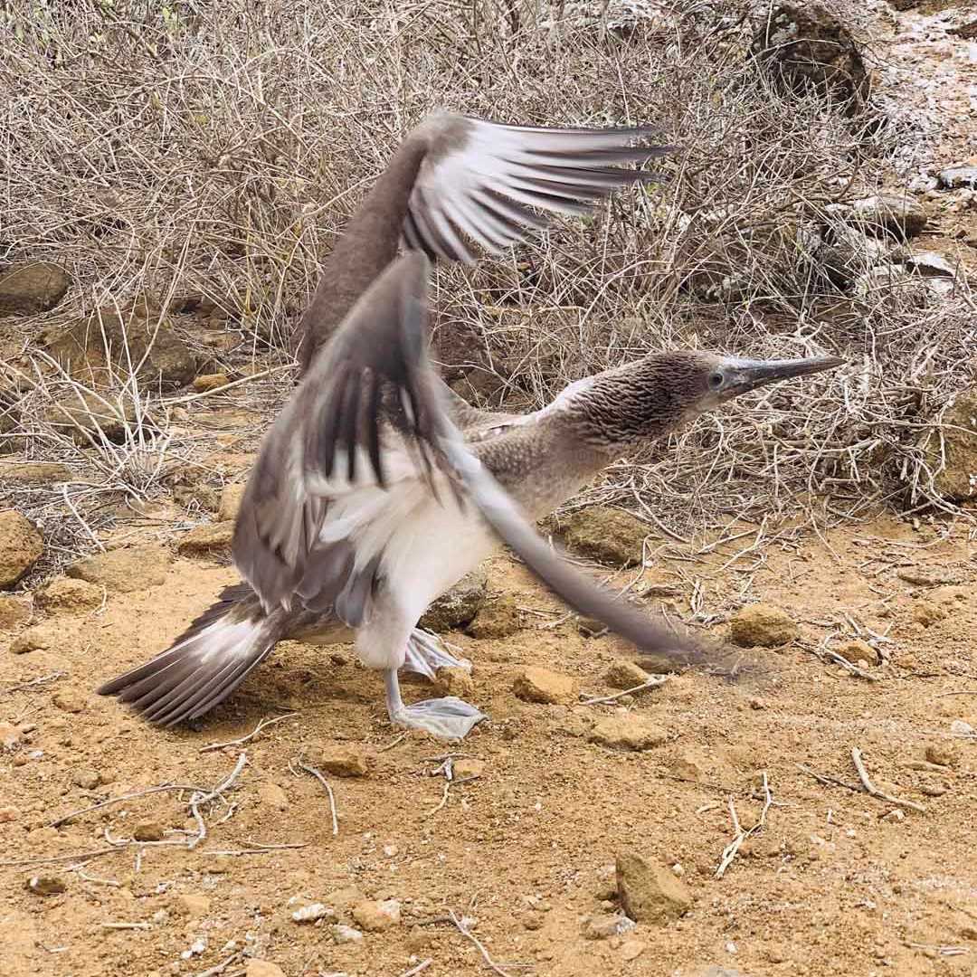We just got into our Zodiacs, and the first thing that caught our eyes in the horizon was a blow of a majestic humpback whale! From a safe distance, we observed that was a mother and a calf having a relaxing time in the waters of Punta Pitt. After some time on the ocean, whale-watching and enjoying this very special moment, we had a wet landing at a sparkling green beach were sea lions rested. We continued with our hike through the eroded canons to reach a higher altitude, where the landscape of Punta Pitt left us amazed. Along this trail that looked barren and solitary, we met so much life and had incredible moments. First, we were entertained by a funny young blue-footed booby learning how to fly, meanwhile at the same time the neighboring blue-footed booby was being fed by his mother, and the challenging moment when she protected the food from the kleptoparasitic frigate bird was tense. We did not know where to look, all these fantastic actions, moments and emotions happening at once!