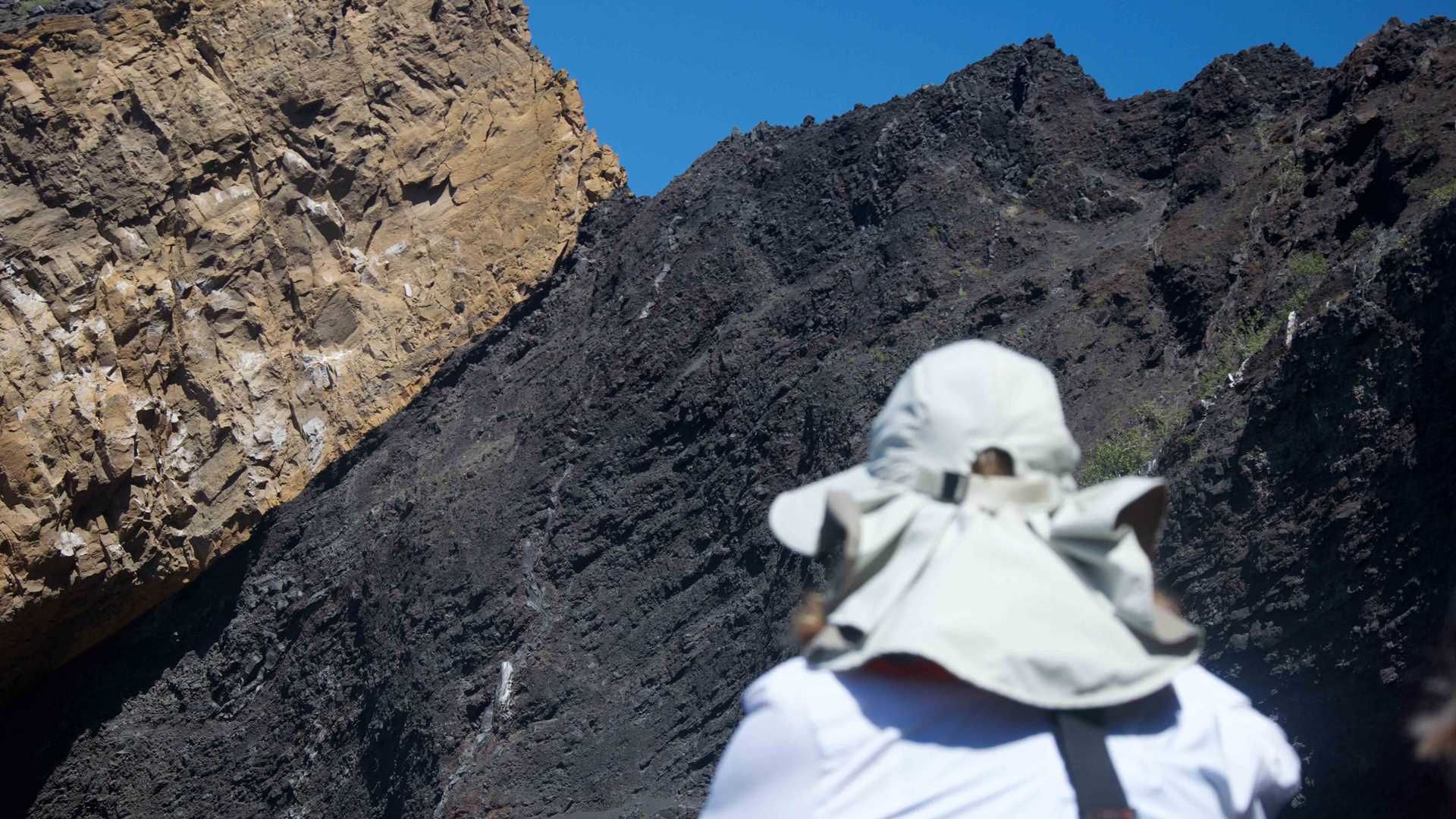 We woke up early in the morning as National Geographic Islander navigated along the northern part of Isabela Island. Slowly the sun appeared above the clouds surrounding Volcano Wolf. We spotted our first birds as Galapagos fur seals returned to shore from their night hunt. We enjoyed a great breakfast. Afterward, expedition leader Vanessa called everyone to the bow to celebrate as we crossed the equator. Our guests happily crossed the line. Approaching Punta Vicente Roca, the visitor site, we spotted Galapagos sea lions and a good number of ocean sunfish. The first activity of the day took place as we dropped anchor at Punta Vicente Roca. This is a spectacular geological site. The combination of the former volcano’s tall cliffs and the tuff cones formed later adds an amazing contrast to this unique visitor site. Our best tools for exploration, our Zodiacs, were lowered down, and off we went to explore the coast. We observed Nazca boobies and blue-footed boobies resting on the small ledges of the tuff cones. Galapagos sea lions swam close to our Zodiac, and Galapagos penguins rested on a broken piece of the tuff cone after feeding. What a wonderful sight! In a calm area, we found a good number of Pacific green sea turtles. The morning’s activities ended with snorkeling. Pacific green sea turtles, plenty of colorful fish, Galapagos marine iguanas and flightless cormorants surrounded us. It was a phenomenal experience! The ship was repositioned toward Fernandina Island. The youngest island of the archipelago, Fernandina is a highlight of our expedition. This island shows our guests the beginning of life. We observed animals thriving in the hostile environment. Pioneer plants like lava cacti grow on the lava fields, breaking down rocks little by little to create soil for the next generation of plants. Punta Espinoza is known for its huge colony of Galapagos marine iguanas. It is hard to distinguish the iguanas from rocks since they are so dark in color. On the other hand, colorful Sally Lightfoot crabs added contrast to the young, dark lava fields. We ended our walk as the sun was setting, returning to the ship with great memories. It was a fantastic day in the western part of the archipelago.