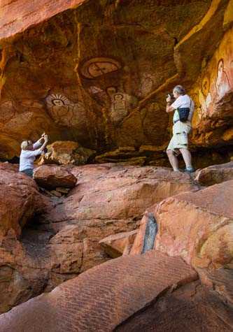 This is the place where we had the opportunity to sight the mysterious and intriguing Wandjina rock art. Wandjinas are the mystic ancestors of the Worrora and related Kimberley Aboriginal people, including the Ngarinyin and the Wunambal tribes. Wandjinas are considered to be the creators of human descendants, the land and laws, and are still able to exert their powers. They are represented by figures displaying large haloed heads with no mouths, painted on sandstone surfaces, usually facing west, or on the walls or ceilings of caves and shelters. Ochres in various colours of reds, browns, yellows, whites and blacks can be utilized as pigments. Most Wandjina paintings were done during the wet when ceremonies were taking place at a particular site. Only men who were the dedicated painters within the tribe took part in the painting.