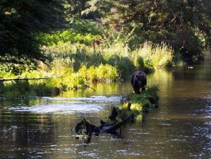 After lunch, we enjoyed the old-growth forest of Lake Eva. Here, we again experienced the temperate rain forest of Southeast Alaska, but this time with sunshine and 70-degree weather. A few river otters were spotted on the side of the stream, hanging out by a large group of salmon making their way up to spawn. Eagle eyes spotted a brown bear leaving the forest and entering the stream, right in front of some of us. The bear proceeded to stand on a log in the middle of the stream, and then swim across to the other side. Incredible!