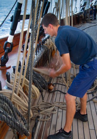 On a square rigger it is the Captain who is completely responsible for the sail plan. He must consider where he wants to get to by the end of the day, the probable wind direction and speed through the day, factors such as currents or cargo shipping lanes, and the ever-changing priorities of an anxious expedition leader. He then calculates his estimated speed under different sail configurations, and finally tells the navigation officer the desired 0800 position from which we will set sail. While we actually needed to head to the north against the prevailing winds for the following day at Olympia, we had built time into the itinerary to sail an opposite course if necessary. The purpose of a square rigger is not to set all sails—some of which block or cancel out the effects of others—but to offer a repertoire of sail combinations to maximize sailing efficiency in any conditions. Since it was our first day on board, Captain Komakin wanted to set an impressive show of sail, but at the same time we did not want to go too fast or too far to the south. In addition, we were just north of the busy Mediterranean shipping lane below the Peloponnesus, so sailing to the south would mean crossing an ongoing flow of cargo ships that are supposed to know that a sailing vessel has the right of way. And finally, the wind was supposed to increase and turn slightly more to WNW in the afternoon, which would drive us even further south.