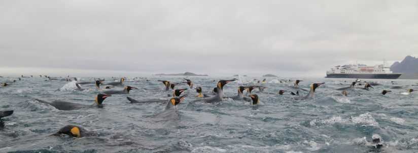 As the fog lifted off the shoreline, the awesome sight and sound of South Georgia’s second-largest king penguin colony at Salisbury Plain came into view. At the height of the season, 60,000 pairs of penguins may raise their young here, with the total colony estimated at 250,000 individuals. Zodiacs zipped us ashore to the abundant welcoming committee that seemed pleased to see us arrive. The king penguins raced rings around the Zodiacs, chirping their welcome. Nearer shore, fur seal pups played in the surf, testing their bravado in the waters, ducking, diving, leaping, and swerving as the Zodiacs landed on the steep, pebbly beach.