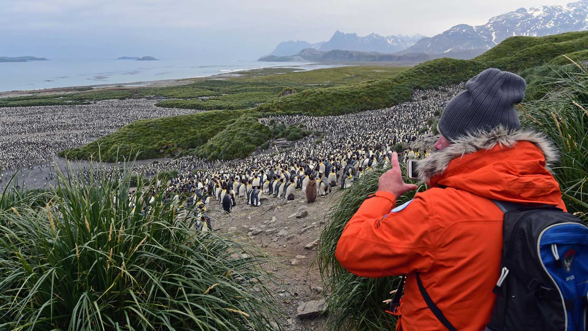 With its overwhelming wildlife, South Georgia well deserves to be called “The Serengeti of the Southern Ocean.” Today we had the fortune to walk amongst tens of thousands of colorful king penguins—literally “a field of gold!” We thought that yesterday´s encounter with the kings in Right Whale Bay might have been hard to exceed, but today we realized that yesterday´s landing was just a taste of what was to come. Today we heard expedition leader Russ´ voice already at 5:30 a.m., calling out for a landing at Salisbury Plain; not only the second largest colony of king penguins on South Georgia, but also rich in other birds and marine mammals: skuas, petrels, the South Georgia pipit, the South Georgia pintail and seals. Holding an estimated 60,000 breeding king penguin pairs plus chicks, this site is truly one of the most spectacular places to visit on South Georgia. Although the sun was hidden behind clouds, the light was soft and great for photography. Many a guest reluctantly finished watching and clicking their cameras before they had to pack their gear and jump on the last Zodiac left to leave the beach.