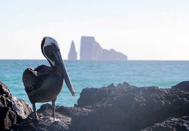 This island is the only location containing all three species of boobies. We easily saw blue-footed boobies nesting with their chicks who are now large enough to move around. The trees and bushes housed nesting red-footed boobies. These are the only nest builders of the three booby species. Along the shore we observed the larger Nazca boobies with their black and white coats blending in with the black lava and their own guano. The red vegetation growing from the ash gives this place a strikingly beautiful contrast.