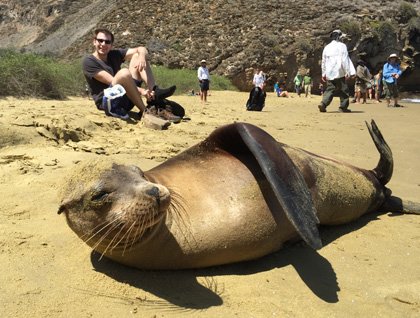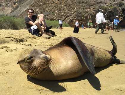 This morning found us ready to look for the third species of booby that occurs in the Galapagos—the red footed booby. We started the day with a short Zodiac ride along the coastal area, where we saw different species of seabirds resting, nesting, and flying overhead, among them swallow-tailed gulls, blue-footed boobies, frigatebirds, Nazca boobies and tropicbirds. We landed at an olivine sandy beach greenish and changed into our shoes to start a hike that took us to the area where the red-footed boobies are nesting. Most of them are in the juvenile stage and we were fortunate to have some of them quite close, allowing us to observe and take pictures. On the way back, we also had the opportunity to observe the nesting of the blue-footed boobies, right in the middle of our trail! We finished our hike at the same landing beach, where everybody found a way to enjoy some beach time. Some of the kids had fun playing with the sand, while other guests went swimming from the beach or went snorkeling with sea lions. The visibility was not at its best, but the water temperature was considerably higher than normal average at this time of the year(77 F).