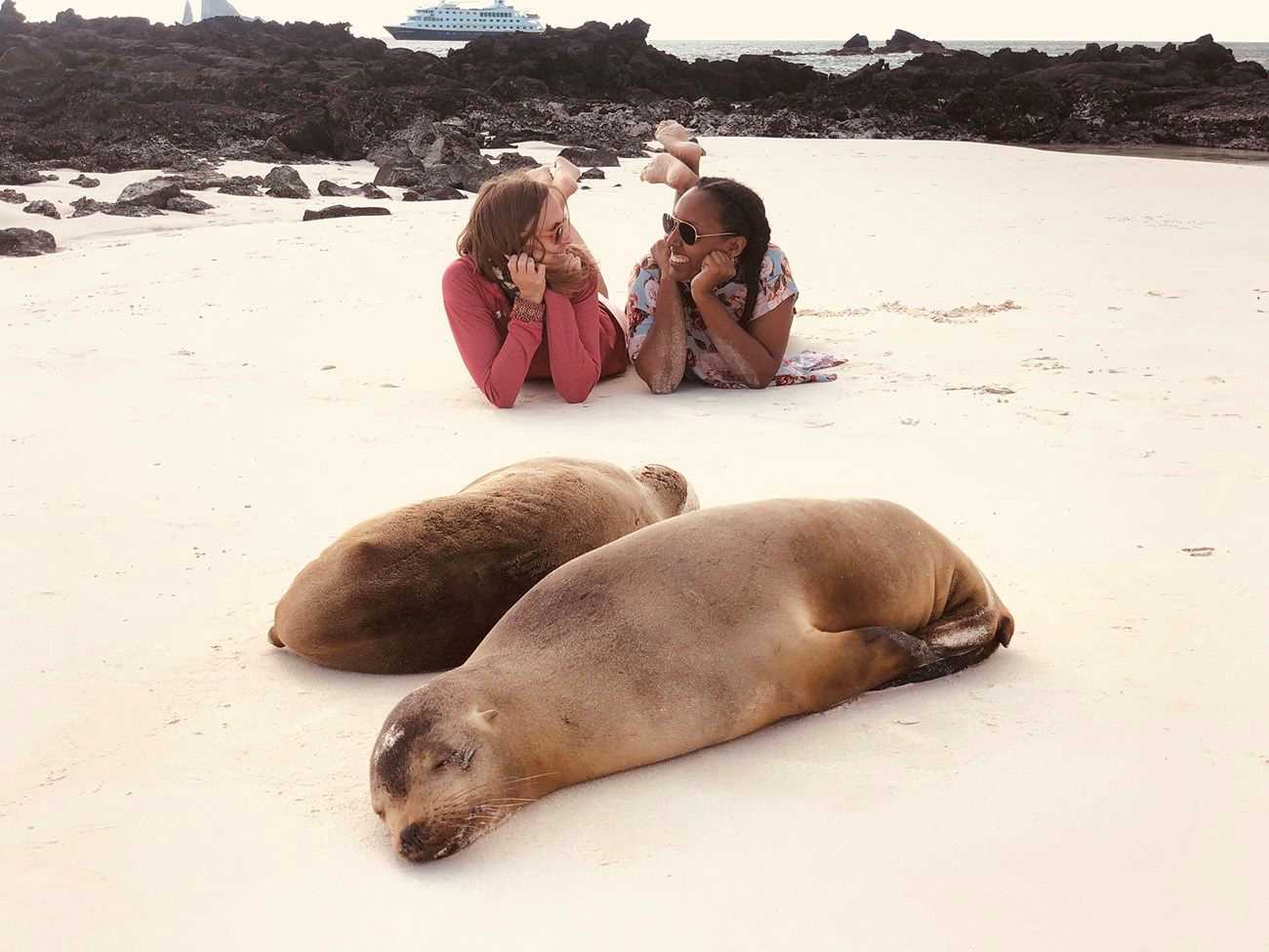 Later in the day, we embarked upon Cerro Brujo for our last outing with our amazing, passionate, and talented Naturalists. We cannot say enough about their presence and enhancement of our expedition. When they speak, you hang upon every word of wisdom and knowledge about the uniqueness and fragility of Galapagos. On Cerro Brujo, we enjoyed our last few words of wisdom from our naturalists and the powdery sand underneath our feet. At first, the sand on Cerro Brujo is more coarse and uninviting to your bare feet, but soon you encounter the transition zone where the effects of wind and water weathering and erosion are evident in the change from coarse grain to finely grained sand. The powdery sand was sprinkled with sea lions sunbathing in small groups. Our expedition family, yes, family, enjoyed time together on the white sand beach frolicking in the water, hiking to the end of the beachfront, and taking in the scenery together one last time.