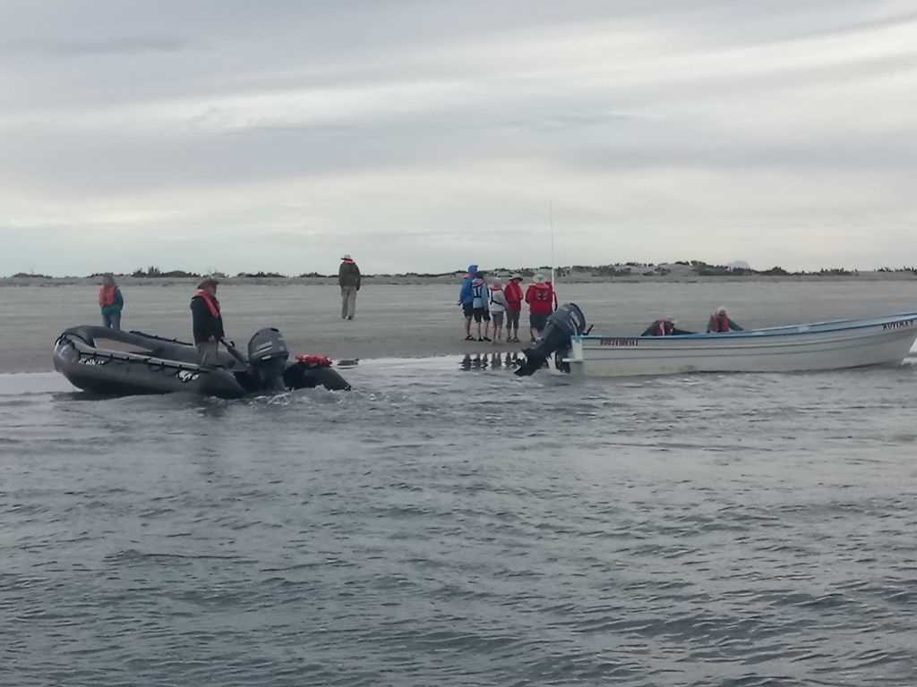 This morning, National Geographic Venture docked at the interesting port, San Carlos. From the 1940s to the 1990s, the port was used for loading agricultural products and fertilizers from the nearby Santo Domingo Valley. Nowadays, San Carlos is basically a place for loading sardines from a local cannery. It is also an important tourist base for whale-watching, principally mating gray whales. At the port, all guests and staff boarded buses to Lopez Mateos, a town located near the northernmost tip of Magdalena Island. The buses traveled across Magdalena Plain, a section of the Sonoran Desert that receives a lot of moisture in the form of dense fog from the Pacific Ocean. Lichens and orchillas, a type of flowering plant, give the desert a phantasmagoric appearance. Guests and staff enjoyed spotting numerous birds, including crested caracaras and kestrels. Once in Lopez Mateos, we boarded local pangas for whale-watching. During two rounds of whale-watching, we encountered several whales close to our pangas. However, most of the whales were preoccupied with traveling, searching for mates, or just finishing their time of reproduction and thus exiting the lagoon. In reality, the whales were not interested in interacting with the boats and their excited cargo, but we had many opportunities to observe the behavior of these magnificent animals. In town, we all delighted in a delicious fish lunch, ‘pescado zarandeado.’ We enjoyed exploring the local dock with its many colorful shops and crafts, and we admired the wonderful sculpture of a cow-calf pair of gray whales.