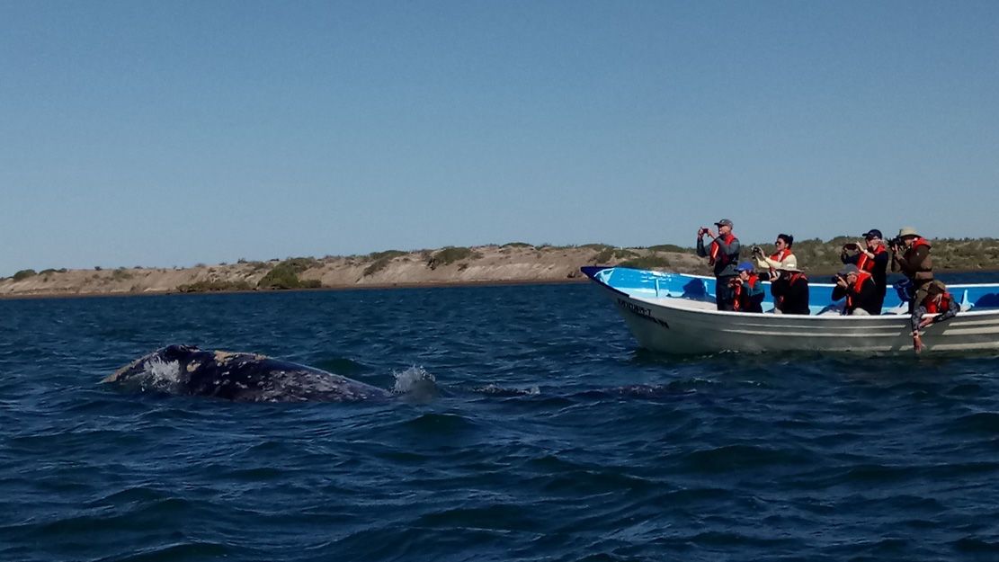 This morning, National Geographic Venture docked at the interesting port, San Carlos. From the 1940s to the 1990s, the port was used for loading agricultural products and fertilizers from the nearby Santo Domingo Valley. Nowadays, San Carlos is basically a place for loading sardines from a local cannery. It is also an important tourist base for whale-watching, principally mating gray whales. At the port, all guests and staff boarded buses to Lopez Mateos, a town located near the northernmost tip of Magdalena Island. The buses traveled across Magdalena Plain, a section of the Sonoran Desert that receives a lot of moisture in the form of dense fog from the Pacific Ocean. Lichens and orchillas, a type of flowering plant, give the desert a phantasmagoric appearance. Guests and staff enjoyed spotting numerous birds, including crested caracaras and kestrels. Once in Lopez Mateos, we boarded local pangas for whale-watching. During two rounds of whale-watching, we encountered several whales close to our pangas. However, most of the whales were preoccupied with traveling, searching for mates, or just finishing their time of reproduction and thus exiting the lagoon. In reality, the whales were not interested in interacting with the boats and their excited cargo, but we had many opportunities to observe the behavior of these magnificent animals. In town, we all delighted in a delicious fish lunch, ‘pescado zarandeado.’ We enjoyed exploring the local dock with its many colorful shops and crafts, and we admired the wonderful sculpture of a cow-calf pair of gray whales.