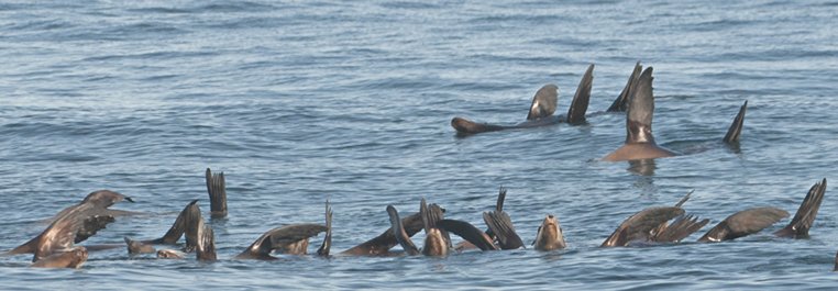 Some of our guests started their morning on the north end of the island in an area of deeply cut canyons that wind through a multicolored volcanic landscape. This was the perfect place to depart on exploratory hikes. Algodón, or desert cotton, and palo blanco trees added verdant accents, along with brilliant-blue morning glories. Many of the northern coastline’s beaches are of coarse gravel, but a few cut back into deeply indented sandy coves. Some of these provide exciting snorkeling, especially when caves and arches beckon or lead to hidden places. Both kayaks and tours in our inflatable craft allowed other guests to merely goof around in boats. One of the highlights on our tours was a line of 50 or more California sea lions enjoying the sun’s warmth by sticking their flippers up. Sea lions have little fat or hair on their large flippers, so holding them out of the water into the sun is a comfortable way to take a snooze. A few of them are shown in today’s expedition photo.