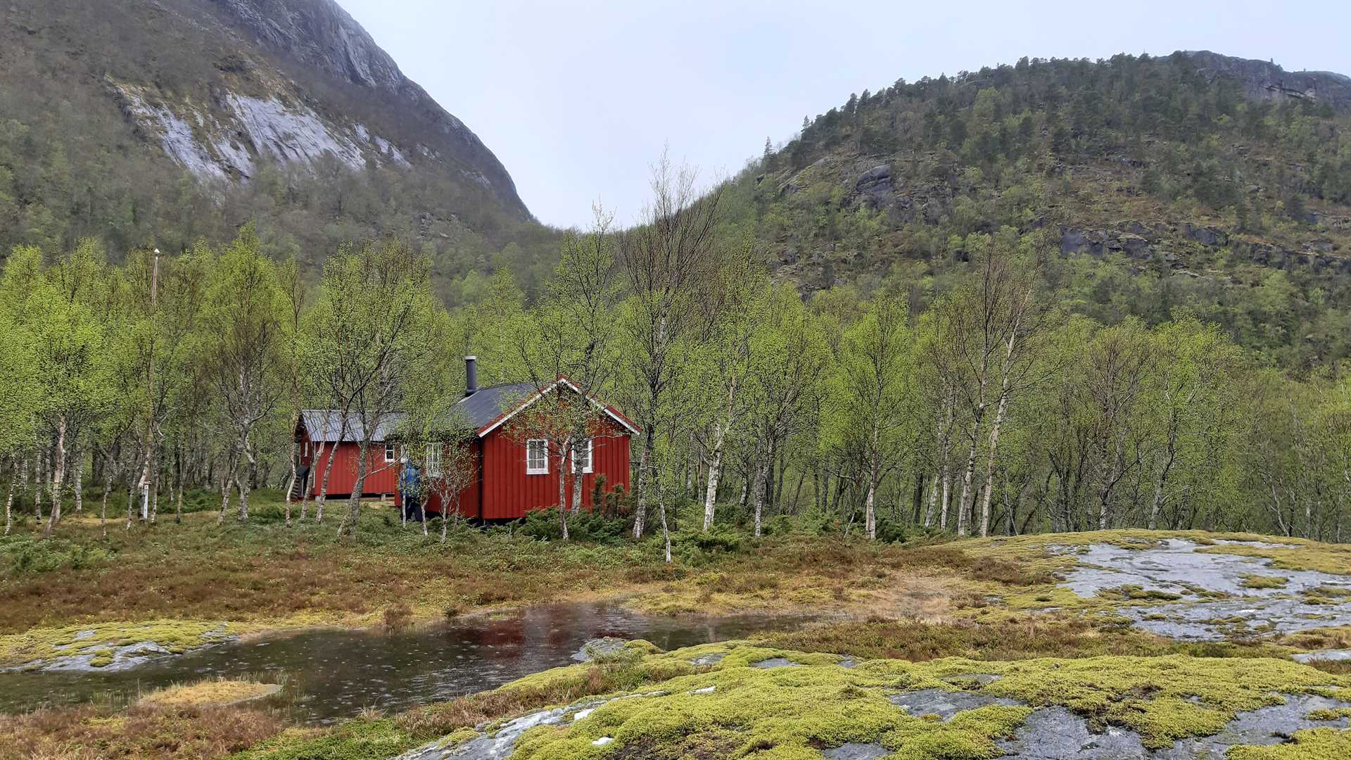 Deeply hidden beneath the steep mountains and covered with birch trees were a few red traditional Norwegian cottages, which are only accessible by sea. No roads lead to this place.