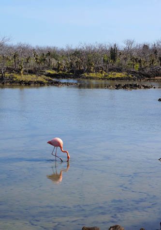 This morning we arrived at the northwestern coast of Santa Cruz Island, where we went ashore to have a hike on Dragon Hill. This is a very special place as it is part of a restoration program for Galapagos land iguanas. These reptiles almost disappeared when feral dogs were introduced here many years ago as pets. As the population of land iguanas declined, the efforts to save them increased; dogs were removed from this area and iguanas were raised in semi-captivity and later returned to Dragon Hill. This morning we saw some of the adults sunbathing while others were resting under the shade. During our walk we also encountered a lonely greater flamingo feeding on brine shrimp from a small brackish water lagoon.