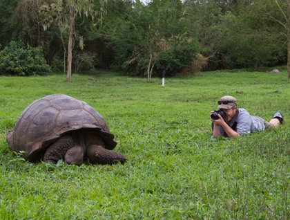 Fueled by a delicious lunch from the local restaurant, Aquelarre, we struck out through the welcome lush of the highlands into the land of the tortoise. We found these giant reptiles by the dozen spread about in fields and forest like boulders, moving only slightly faster as they plodded along in their seasonal migration. You may hear of the Galapagos giant tortoises or you may watch them in documentaries, but nothing prepares you for the opportunity to lay belly-down in the pasture eye to eye with them as they eat grass, shift their grand bodies, eat some more grass, and remind you to slow down.