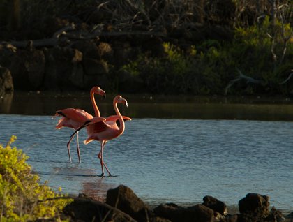 Our new day in the Galápagos Islands started with an early morning landing at Santa Cruz Island. Enthusiastic photographers were chomping at the bit to take advantage of the magical morning light at Cerro Dragón. We touched land at six in the morning, while golden light bathed the island. Prickly pear cacti and leafless Palo Santo trees lined the landscape along the trail. After a few meters into the trail, we encountered a still water lagoon, where marine iguanas peacefully rested half-submerged. Magnificent reflections could be seen, and we were delighted with the endless composition possibilities. Suddenly, a pair of flamingos showed up. We kept walking through the trail to get the best possible angles for photography, and were lucky to see the colorful birds in their natural habitat. Land iguanas are a highlight of this trail. We searched between the dry shrubs and grasses to find several of them. Land iguanas are large, colorful and very tolerant of our presence. We spent hours either searching or photographing these primitive reptiles, while learning about them from our knowledgeable guides.