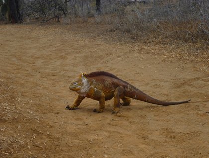Today we started our day at the northwest end of Santa Cruz Island, at a visitor site of the national park known as Cerro Dragon, named after the Galapagos land iguanas. After our breakfast, we disembarked on a rocky coast that took us to a trail by the coast. The morning was spectacular, and blue skies and sunshine were our companions during this hike. On the coast we spotted several marine iguanas sun basking on the green carpet mat plant, creating perfect photo opportunities. Further on we walked by a brackish lagoon that took us to the land iguana’s territory. After learning about the ecology and biology of these endemic reptiles we climbed the small hill found in this place. From the top we had an amazing view of Santiago Island and a group of small satellites islets known as Guy Fawkes. Later on we walked back to the coast to head back to the National Geographic Endeavour.