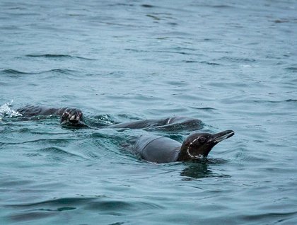 The morning outing took place along the coastline of Santiago, which looked gigantic with its spectacular black lava field which is the result of the last eruption in 1897. From the Zodiacs we saw a dozen Galapagos penguins that were foraging in the shallow canal that separates Santiago from sombrero Chino. We also sighted lava herons, Galapagos hawks, marine iguanas as well as sea lions during this morning’s expedition. Later in the morning we went to a small white sand beach where we spent time with sea lions while others went snorkeling along the canal. The underwater world was abundant with different kinds of fish, rays, white tipped reef sharks and penguins.