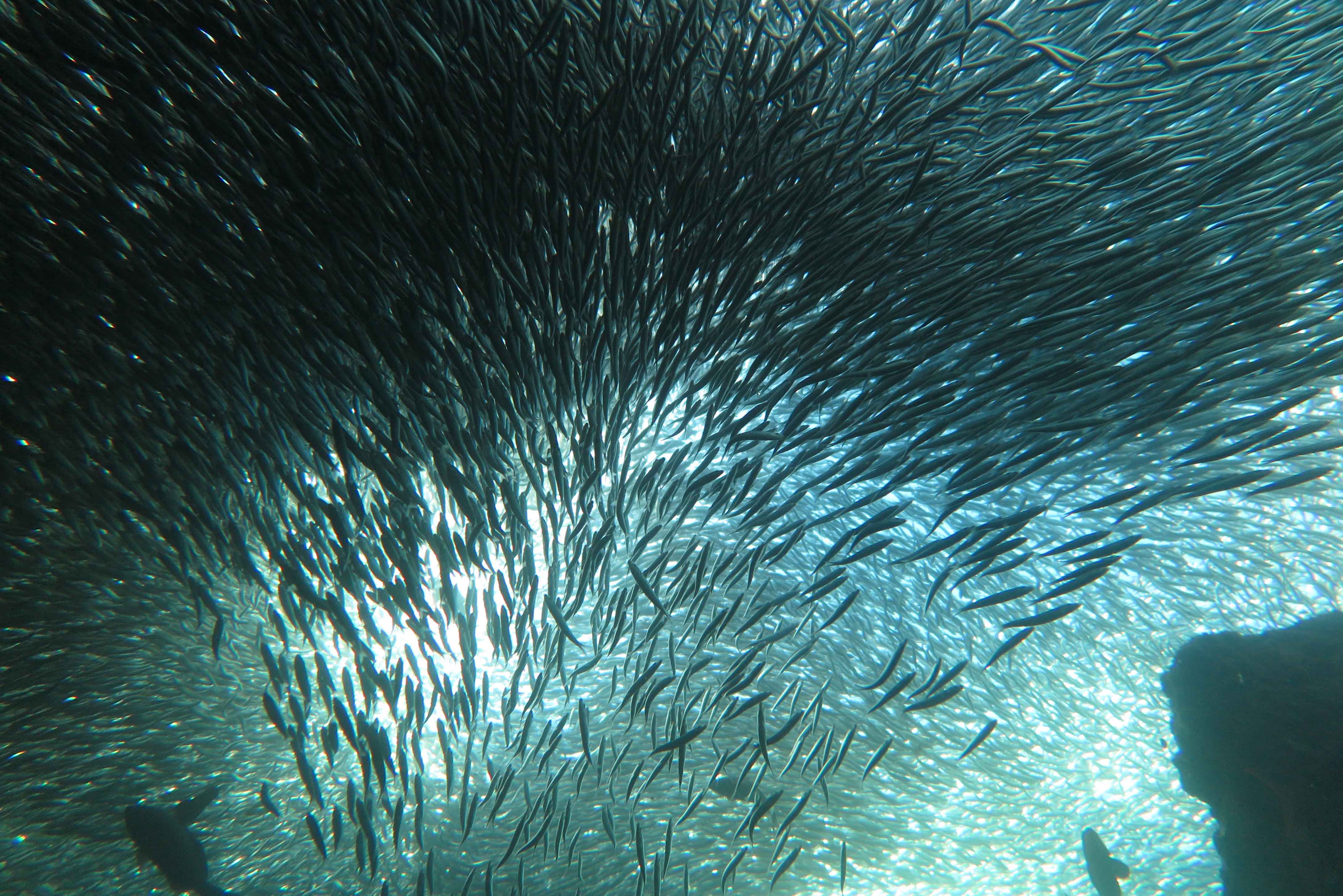 Some of us spent the afternoon looking for more action along the shore, and we found something exceptional here—hundreds of thousand anchovies, perhaps the largest school that I’ve seen over years of free diving! The feeding frenzy was attended by blue-footed boobies, pelican barracudas, albacore, pacific sierra and even yellowfin tuna! It was the most amazing moment, with the low afternoon sunlight, perfect for photography underwater. Some areas were dark enough to be disorientating—the sun could not be seen from down there, and we relied on bubbling in the water to help us find our way back to the surface. It was an exciting experience.