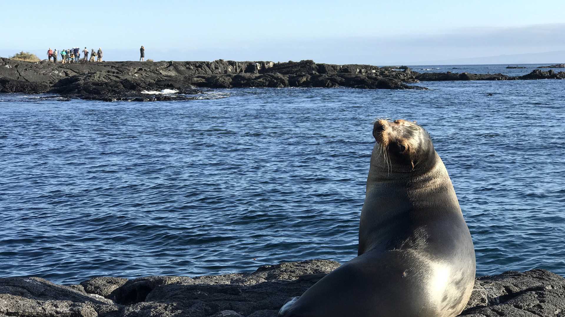We woke up early in the morning as National Geographic Islander navigated along the northern part of Isabela Island. Slowly the sun appeared above the clouds surrounding Volcano Wolf. We spotted our first birds as Galapagos fur seals returned to shore from their night hunt. We enjoyed a great breakfast. Afterward, expedition leader Vanessa called everyone to the bow to celebrate as we crossed the equator. Our guests happily crossed the line. Approaching Punta Vicente Roca, the visitor site, we spotted Galapagos sea lions and a good number of ocean sunfish. The first activity of the day took place as we dropped anchor at Punta Vicente Roca. This is a spectacular geological site. The combination of the former volcano’s tall cliffs and the tuff cones formed later adds an amazing contrast to this unique visitor site. Our best tools for exploration, our Zodiacs, were lowered down, and off we went to explore the coast. We observed Nazca boobies and blue-footed boobies resting on the small ledges of the tuff cones. Galapagos sea lions swam close to our Zodiac, and Galapagos penguins rested on a broken piece of the tuff cone after feeding. What a wonderful sight! In a calm area, we found a good number of Pacific green sea turtles. The morning’s activities ended with snorkeling. Pacific green sea turtles, plenty of colorful fish, Galapagos marine iguanas and flightless cormorants surrounded us. It was a phenomenal experience! The ship was repositioned toward Fernandina Island. The youngest island of the archipelago, Fernandina is a highlight of our expedition. This island shows our guests the beginning of life. We observed animals thriving in the hostile environment. Pioneer plants like lava cacti grow on the lava fields, breaking down rocks little by little to create soil for the next generation of plants. Punta Espinoza is known for its huge colony of Galapagos marine iguanas. It is hard to distinguish the iguanas from rocks since they are so dark in color. On the other hand, colorful Sally Lightfoot crabs added contrast to the young, dark lava fields. We ended our walk as the sun was setting, returning to the ship with great memories. It was a fantastic day in the western part of the archipelago.