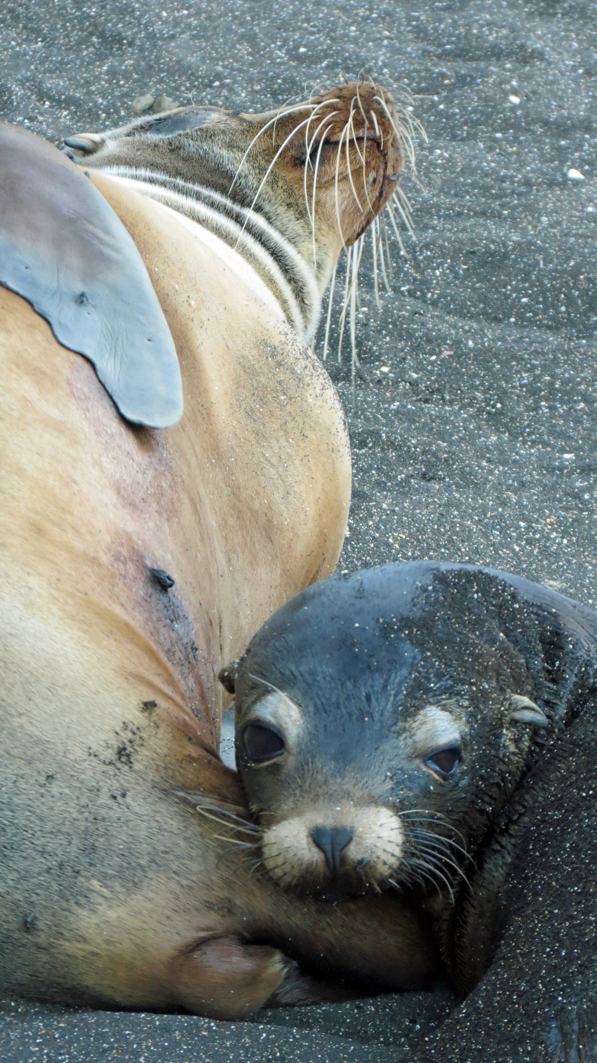 In the afternoon we went to visit Puerto Egas. We landed on a beach of black basaltic sand where colorful crabs scampered and sea lions basked under the warm sun. Some marine iguanas were also warming up after feeding on algae in the cold waters. Walking inland, we entered the arid zone where we found several land iguanas struggling to survive in this desert ecosystem, trying to hang on until Mother Nature sends rain. December is usually the beginning of the rainy season, but it seems delayed.