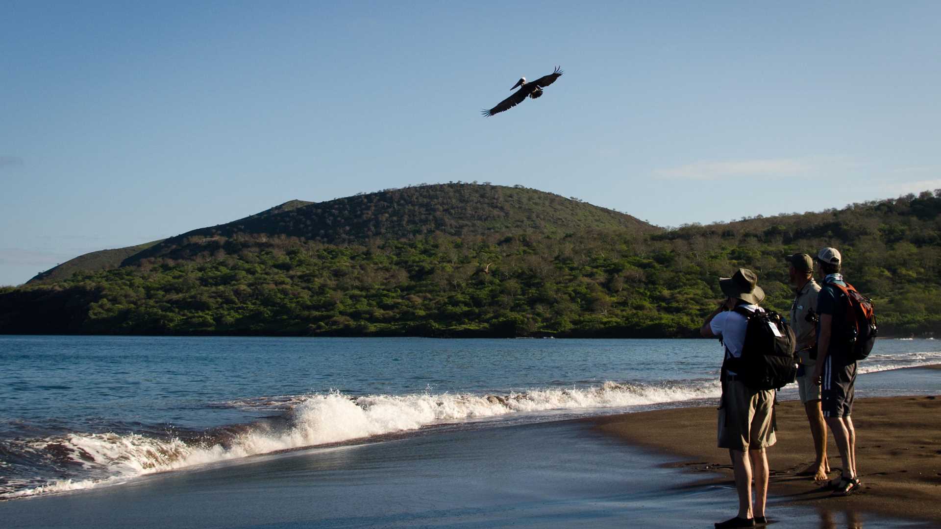 Today we arrived at the anchorage off Espumilla Beach at first light. Here, on the east coast of Santiago Island we started our day with some pre-breakfast activities. Some guests explored the shoreline on kayaks while others landed on the dark sand beach for a stroll amongst the old mangrove forest that protects the coast just inland of the beach.